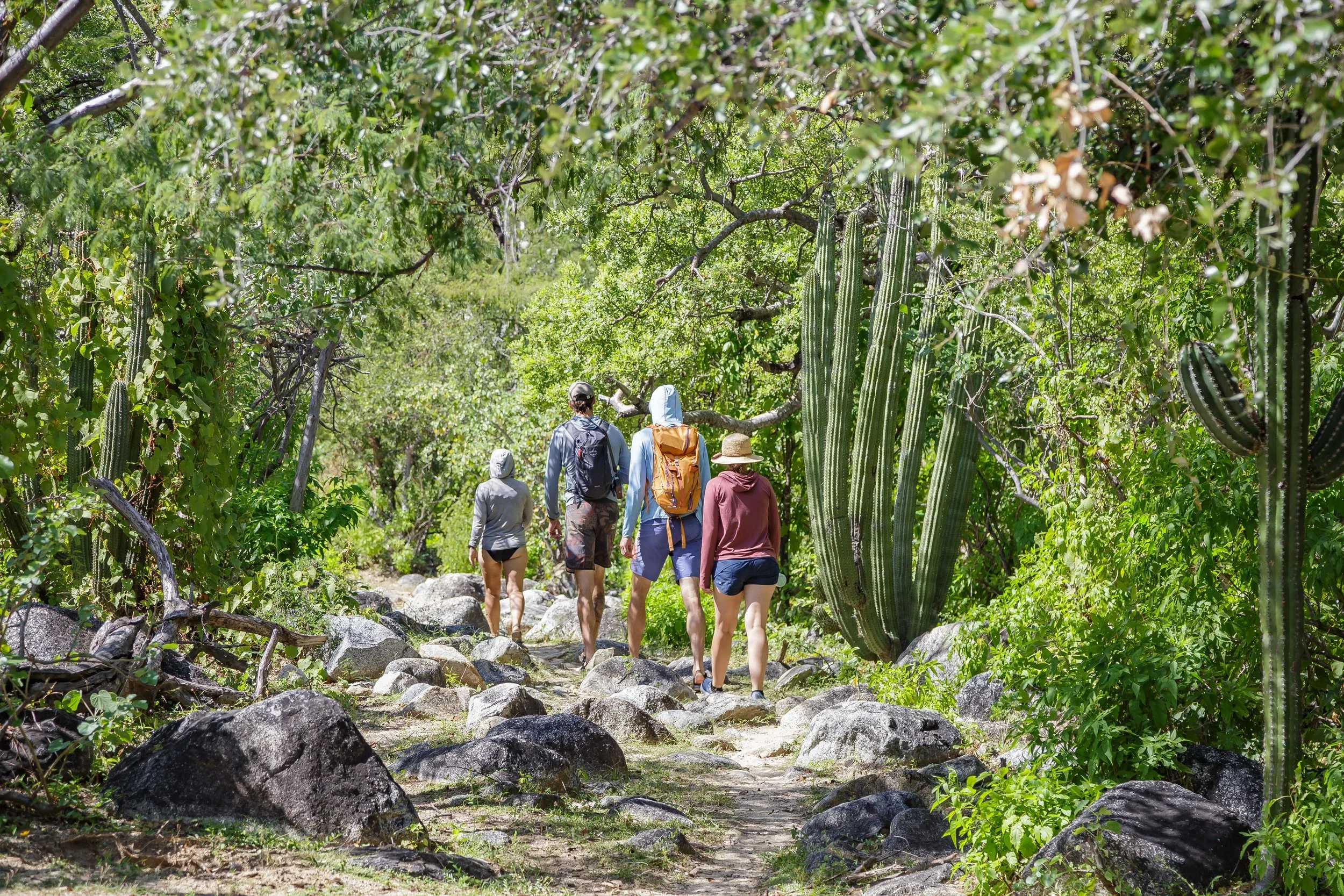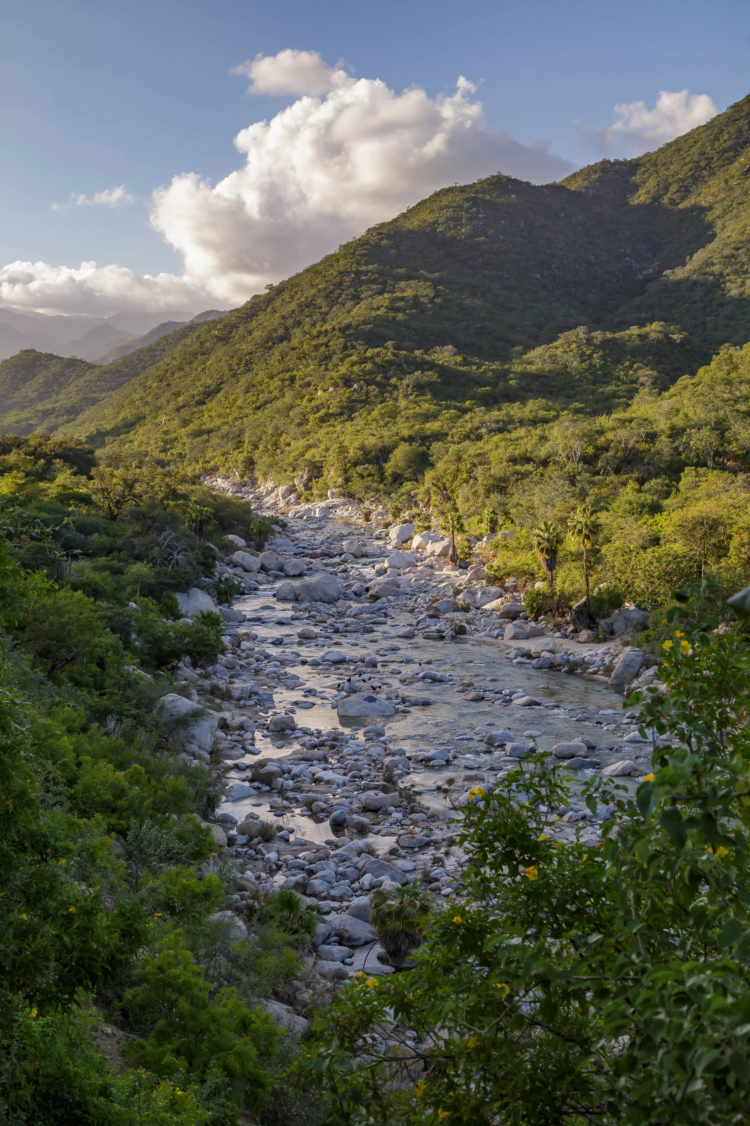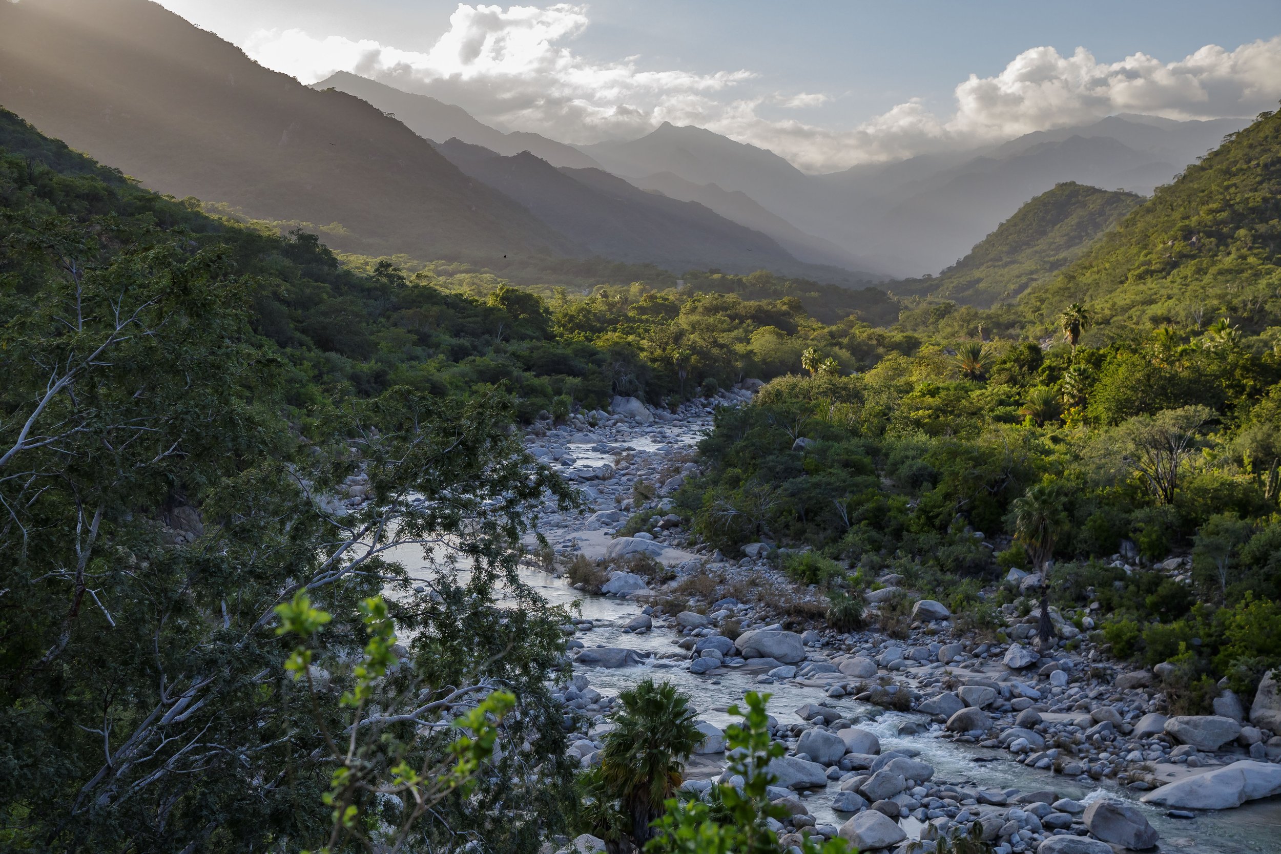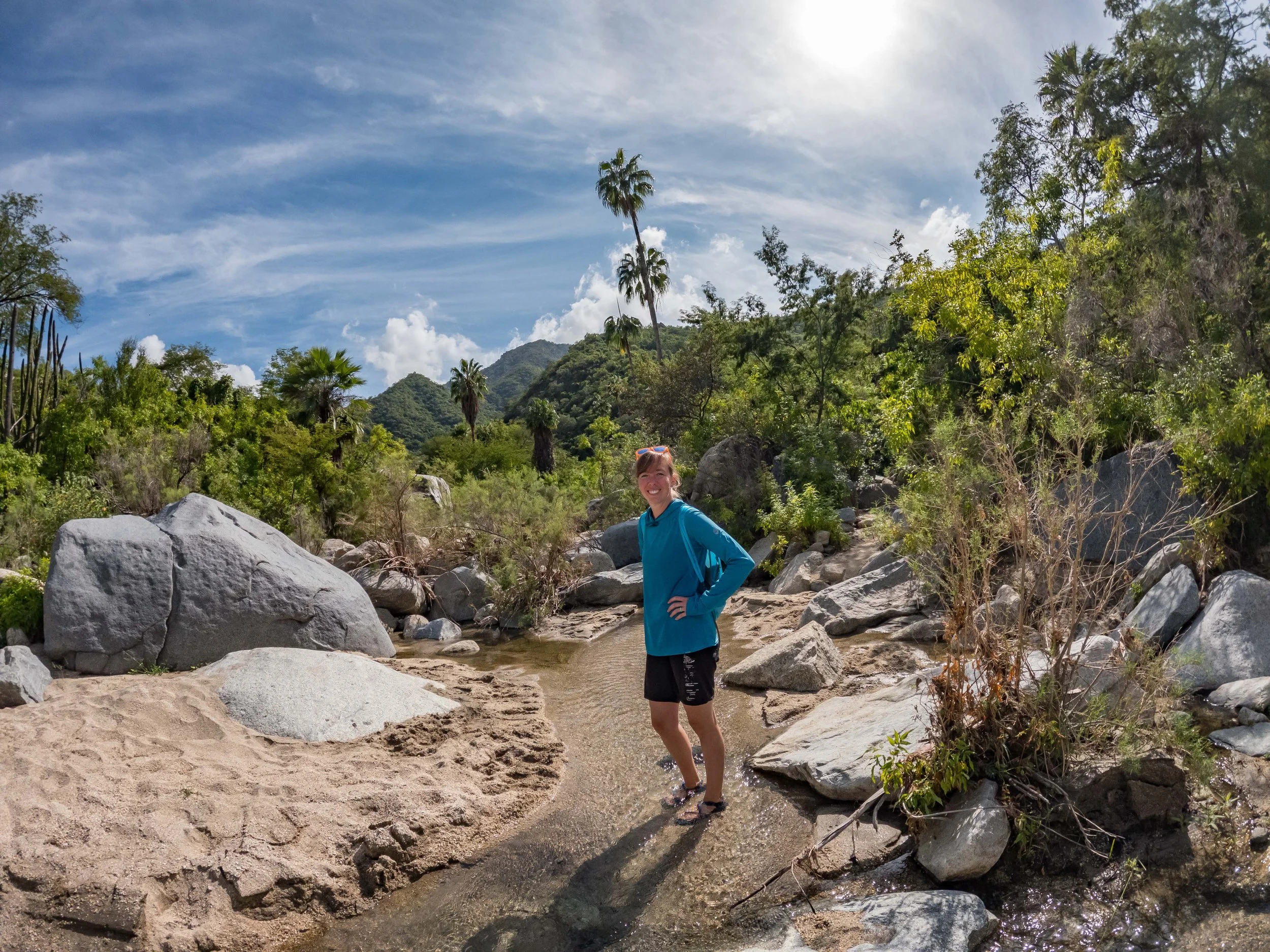 The next morning we were greeted with hot coffee - Clarence gets up every morning and makes coffee for his guests, and we understand he’s had up to thirty people camping with him during the busy season. He says the max capacity of the campground is roughly 15 overland rigs, from giant 6x6 rigs all the way down to cyclists, with the biggest parked in between the rows of his lime trees. After an easy morning we were motivated to hike about an hour up the valley to a picturesque swimming hole, described to us as the best swimming hole in the entire valley, so we donned our adventure outfits and headed off. The trail was really nice, even flagged in some places for an upcoming adventure race. The trails lead all over the valley and up into the mountains, even connecting to a neighboring coastal town across the mountain range, Todo Santos. Clarence was describing the local ecosystems, and told us that if we walked far enough we would eventually hit pine forests, thousands of feet up in elevation. Baja contains multitudes, and it’s easy to forget that this sandy peninsula also has a rocky spine of peaks running down its back.