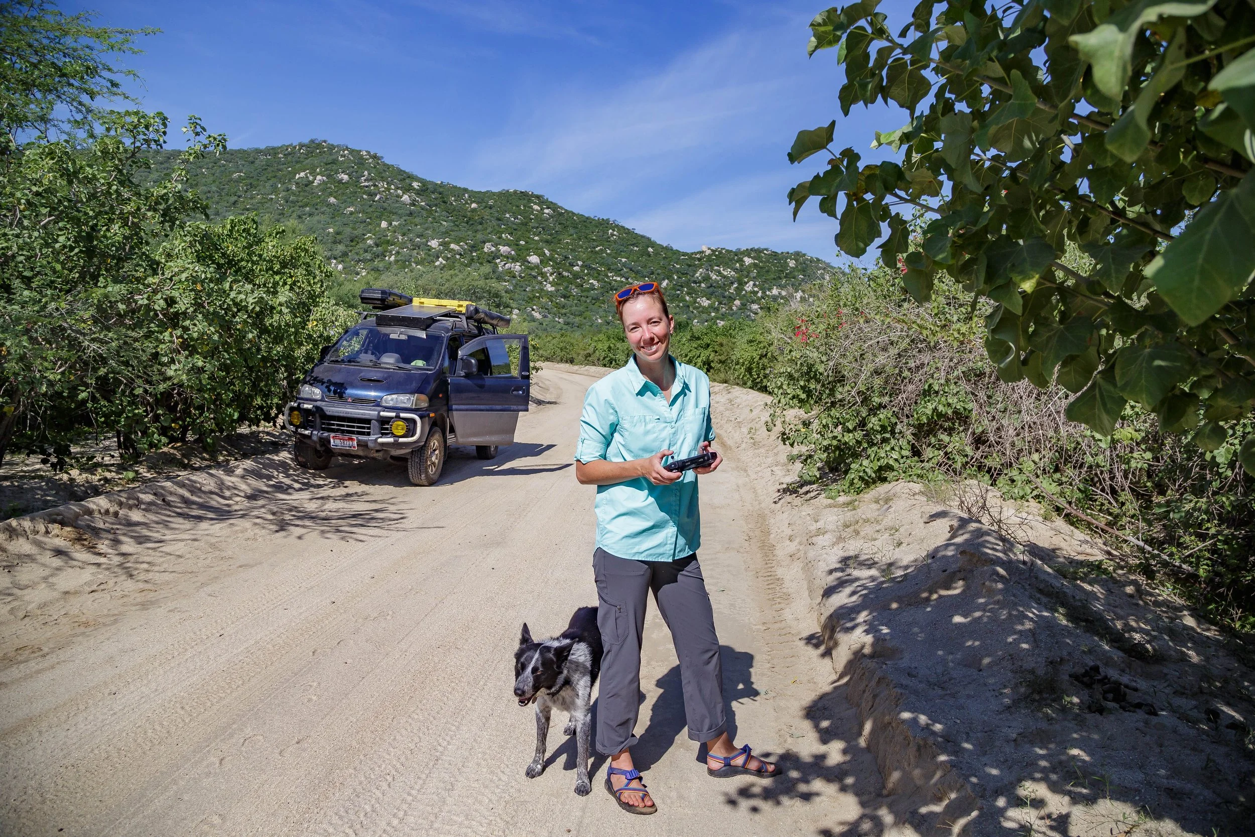 We supplied up in Los Barriles, and then ditched the red van to set out on our own and get to the ranch just a little more quickly. The sun was already getting lower than we wanted, and we had heard that the drive to the ranch could be…adventurous, so we wanted to give ourselves as much sun as we could. Team VW was comfortable with driving later in the day, but we weren’t, and that’s why vehicle autonomy is so important, it lets you take the risks you want to take, when you want to take them. For us, our risk calculation put us in the canyon just before golden hour, perfect timing for some amazing scenic shots of the river and valley leading to Rancho San Dionisio. We wanted to keep pressing on, as we were driving a twisty dirt road we had never driven before, pretty close to dusk, but I forced Chelsea out of the van a few times because the light was so good. Like always, she made the best of a good situation.