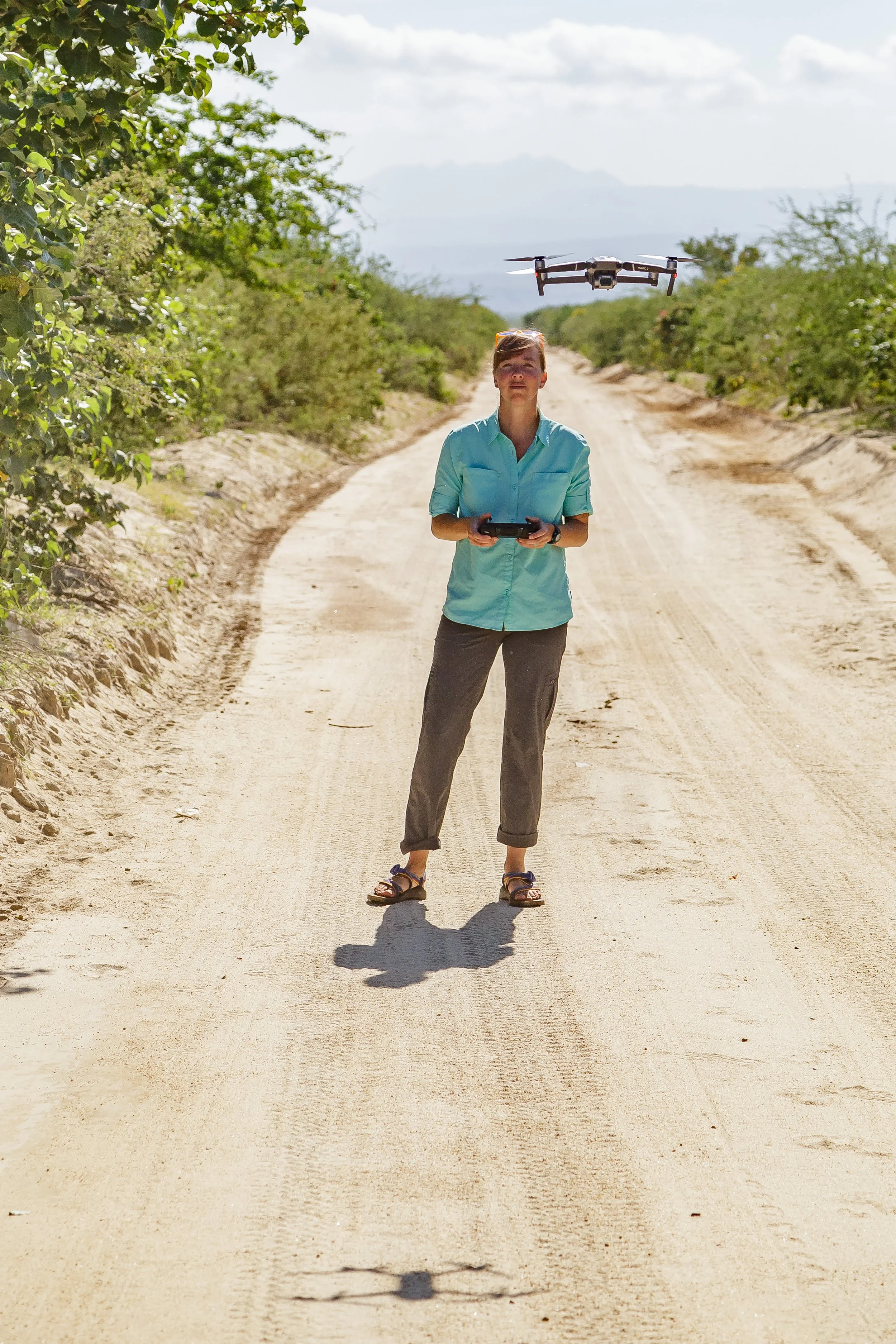 Sam flying her drone to get some shots of the lone VW driving the sandy path out.